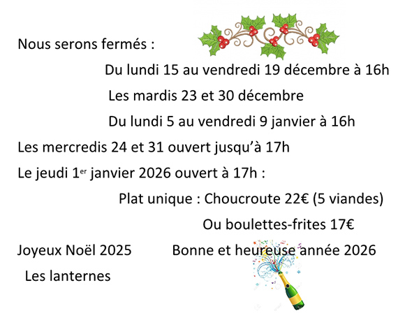 Congés hebomadaires:Fermé le Mardi et Mercredi |